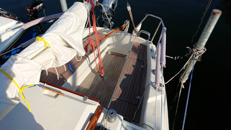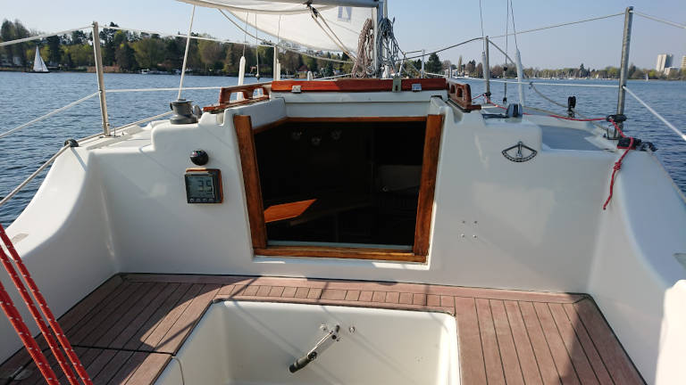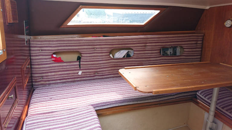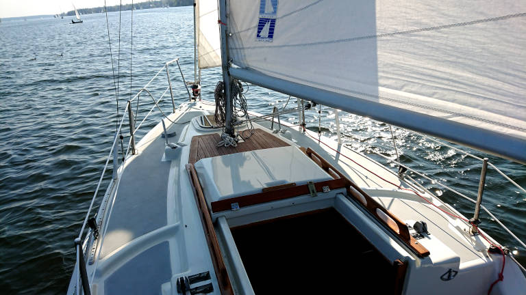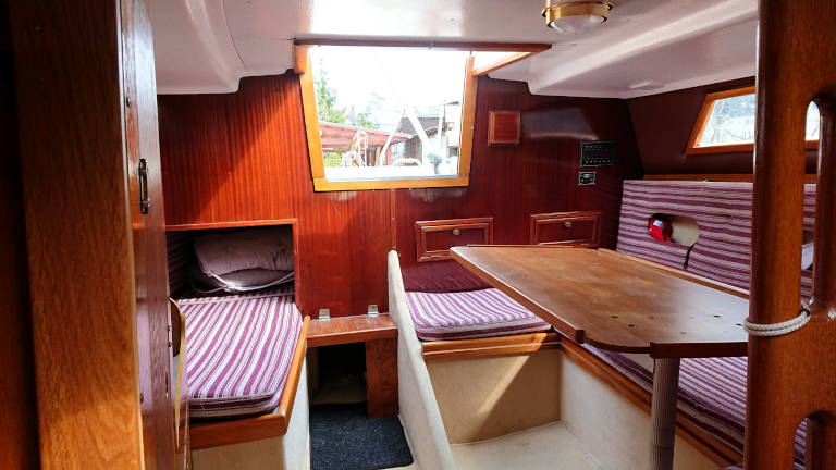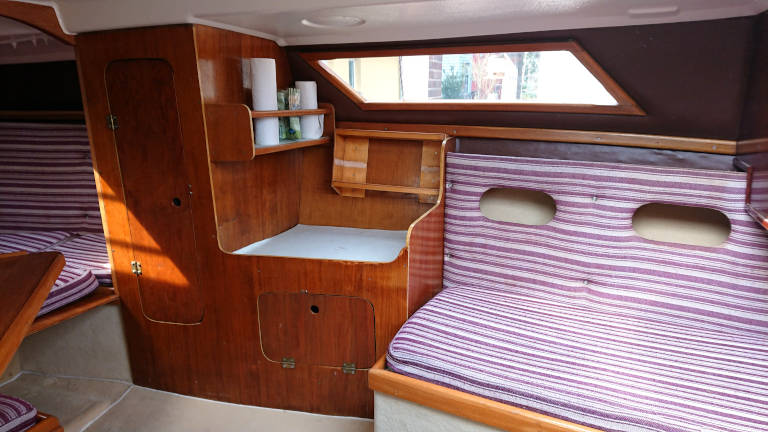 Die "Tante" ist ein kleines Raumwunder. Auf ihren nur 6,5 Länge bietet sie Platz für bis zu 5 Personen - und zwar sowohl im Cockpit als auch unter Deck in der Kajüte. Wer möchte kann hier z.B. problemlos mit 2 Erwachsenen und 3 Kindern auf dem Schiff übernachten. Das Cockpit ist mit schicken Teakholz-Flächen ausgekleidet und bietet durch den hohen Süllrand sehr viel Schutz gegen Wind und Spritzwasser. Die Tante ist auch mit einem Seezaun ausgestattet, welcher allen Crewmitgliedern - und insbesondere den Kindern - überall an Bord einen sicheren Halt bietet. Unter Deck ist diese kleine Segelyacht in 2 Räume unterteilt: Eine "Bugkabine" mit einer Doppelkoje für zwei Personen und Platz für ein sehr komfortables Trocken WC. Und der "Salon" mit einer U-Sitzecke / Dinette inkl. schwenkbarem Tisch, einer kurzen Achterkoje / Hundekoje, einem Kleiderschrank und Platz für eine kleine Pantry. Die U-Sitzecke mit dem Tisch kann auch in eine Doppelkoje umgebaut werden.